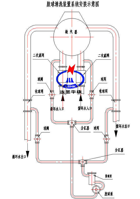 一、冷凝器在線膠球清洗系統(tǒng) 1、冷凝器在線膠球清洗裝置(冷凝器膠球清洗裝置)的制造按國家標(biāo)準(zhǔn)《冷水機組水冷管殼式冷凝器膠球自動在線清洗裝置》JB/T11133-2011執(zhí)行。 2、冷凝器在線膠球清洗裝置的部件:1、裝球器2、收球器3、發(fā)球泵4、PLC程控系統(tǒng)5、電動球閥 裝球器:裝球器是用于裝球、取球、觀察膠球運行狀況的裝置。此裝置設(shè)置有足夠的容積,保證海綿膠球有回旋的余地。 收球器:收球器安裝在冷凝器出水管道上,用于將膠球從冷卻水中分離并收集起來,再由膠球泵將膠球送至裝球器。收球器具有收球率高、水阻小、適應(yīng)性強等優(yōu)點。收球器設(shè)計檢修手孔,結(jié)構(gòu)方便清污檢修。收球器上安裝壓力表,當(dāng)壓降超過許可值時要停機清污。收球器濾網(wǎng)的材質(zhì)采用不銹鋼耐腐蝕材料。收球器的過濾孔徑不小于3mm。 膠球支配器:采用優(yōu)質(zhì)鑄鋼焊接而成,配有透明的觀察窗,能夠直觀的觀察到膠球的運行情況及質(zhì)量狀態(tài)。合理分配膠球的去向,確保凝汽器兩側(cè)的清洗幾率,杜絕了因循環(huán)水兩側(cè)壓差過大引起的膠球只清洗一側(cè)的可能。 發(fā)球泵:采用單吸臥式離心泵,具有不損球、不堵塞、運行平穩(wěn)、使用壽命長等優(yōu)點。泵的通流部分可以采用不同性能不銹鋼制造,適用于以不同水質(zhì)為冷卻水源的空調(diào)系統(tǒng)。軸承采用SKF。 發(fā)球器:噴球器把清洗膠球噴射入冷卻水管線的入口,實現(xiàn)了良好的膠球分配,保證每一個冷卻管都有近似相等清洗的機會和頻率。發(fā)球機有排氣和排水機構(gòu),有加球和放球機構(gòu)。 分匯器:配有透明的觀察窗,能夠直觀的觀察膠球的運行狀況。 清洗膠球:膠球具有耐磨性能,質(zhì)地柔軟富于彈性、材質(zhì)均勻,氣孔均勻貫通。干態(tài)膠球直徑誤差不大于公稱直徑的±2%且不超過±0.2mm。濕態(tài)膠球視相對密度為1.00~1.15,在使用期內(nèi)及5-45℃水溫下膠球直徑脹大不超標(biāo)且不老化,濕態(tài)膠球直徑比冷凝器換熱管的內(nèi)徑大1-2mm。膠球耐腐蝕,在壽命周期內(nèi)性能不變。 PLC程控系統(tǒng): 采用PLC控制,PLC采用西門子品牌,觸摸屏品牌與PLC一致。根據(jù)需要靈活設(shè)定清洗頻率。裝置能接入空調(diào)控制系統(tǒng),該裝置的遠(yuǎn)程控制、顯示、保護、報警、聯(lián)鎖等功能的設(shè)計,并提供符合控制系統(tǒng)要求的電氣、數(shù)據(jù)通訊接口RS485(暫定)和必要的技術(shù)支持。  |